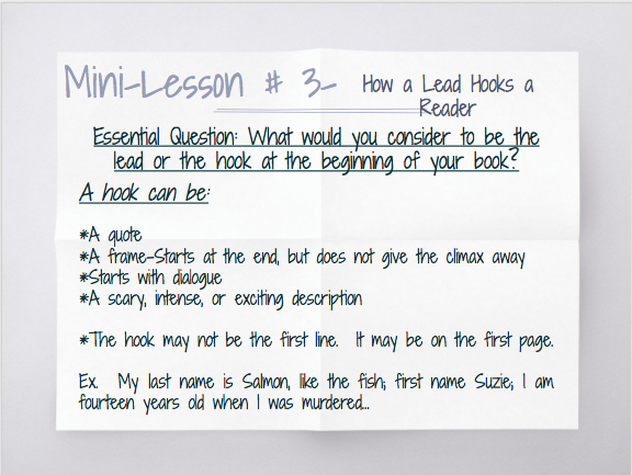 Thursday I introduced my students to the third mini-lesson on “How a Lead Hooks a Reader”.